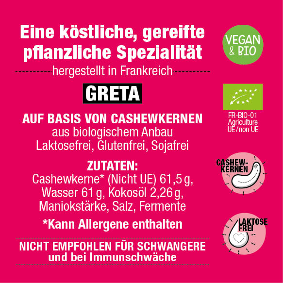 Cashewkerne* (Nicht UE) 61,5 g, Wasser 61 g, Kokosöl 2,26 g, Maniokstärke, Salz, Fermente
