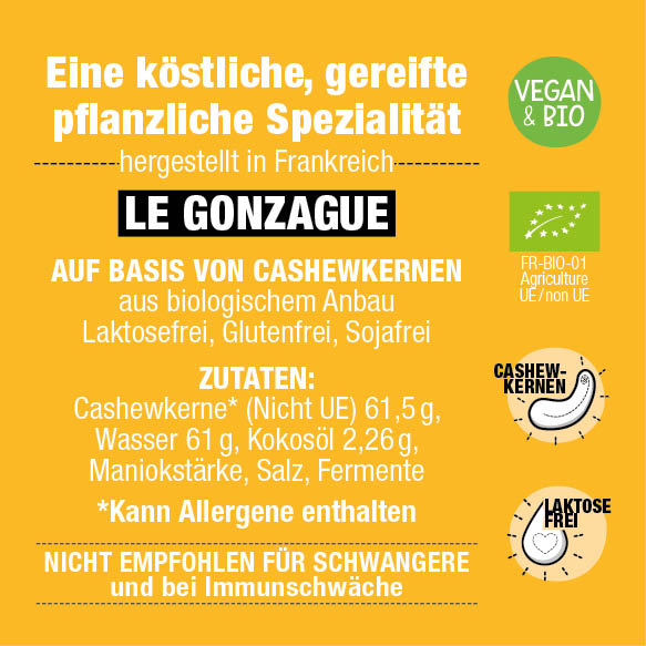Cashewkerne* (Nicht UE) 61,5 g, Wasser 61 g, Kokosöl 2,26 g, Maniokstärke, Salz, Fermente