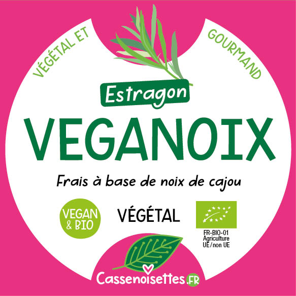 Noix de cajou* (origine non UE) 61,5g, eau 61g, graine de lupin, fécule de manioc, poudre d’ail, poudre d’oignon, sel de guérande, huile de coco, estragon